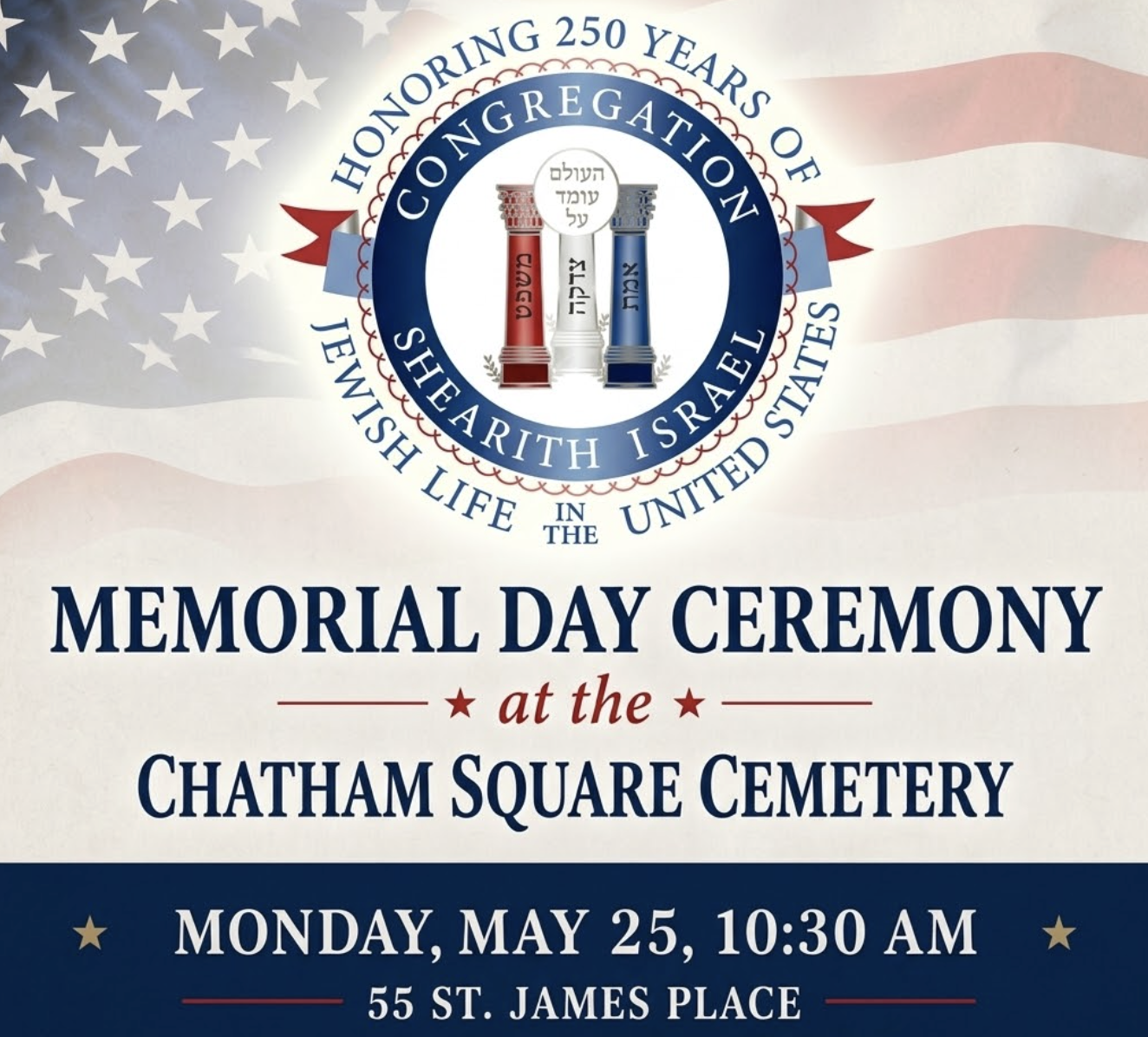 Welcome to Congregation Shearith Israel, America's first Jewish congregation, founded in 1654 by 23 Jews of Spanish and Portuguese descent. Today, Jews of all backgrounds make up our welcoming, traditional community. Explore this site, and then visit the synagogue to experience the beauty and vitality of this Jewish and American treasure.