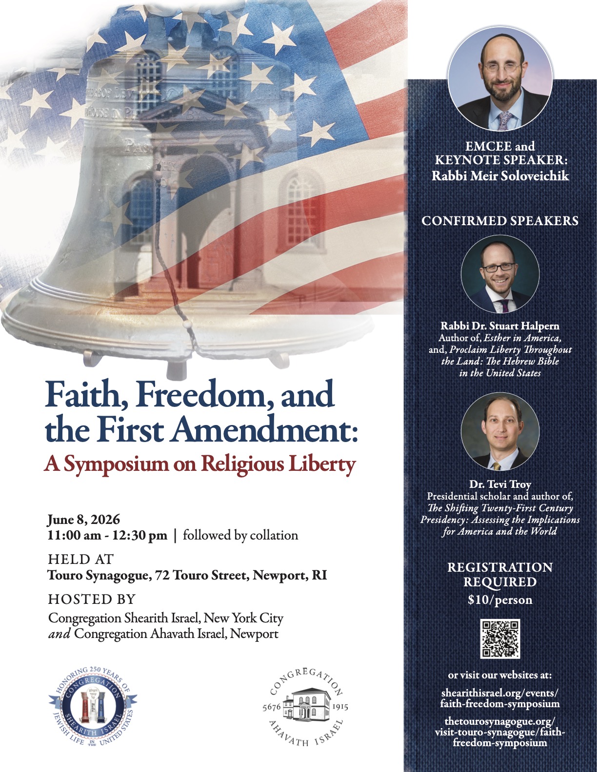 Join Congregation Shearith Israel (New York) and Congregation Ahavath Israel (Newport) on Monday, June 8th, at the historic Touro Synagogue for this special Semiquincentennial program. Hear from Rabbi Soloveichik and fellow scholars, including Dr. Stuart Halpern and Tevi Troy.