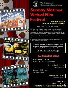 This time we are offering FOUR Israeli films — one each in November, December, January and February — each to be viewed at your leisure.