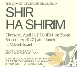 Whether near or far, the women of our congregation are invited to recite the Song of Songs. This year, we will be partnering with our sister synagogue, Mikveh Israel of Philadelphia.