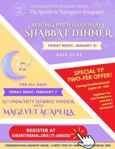 Join Congregation Shearith Israel’s Young Professionals as we enjoy a delightful Shabbat dinner. We’d love for everyone to join us for services, but if you cannot make it, you are still most welcome to join us for dinner.